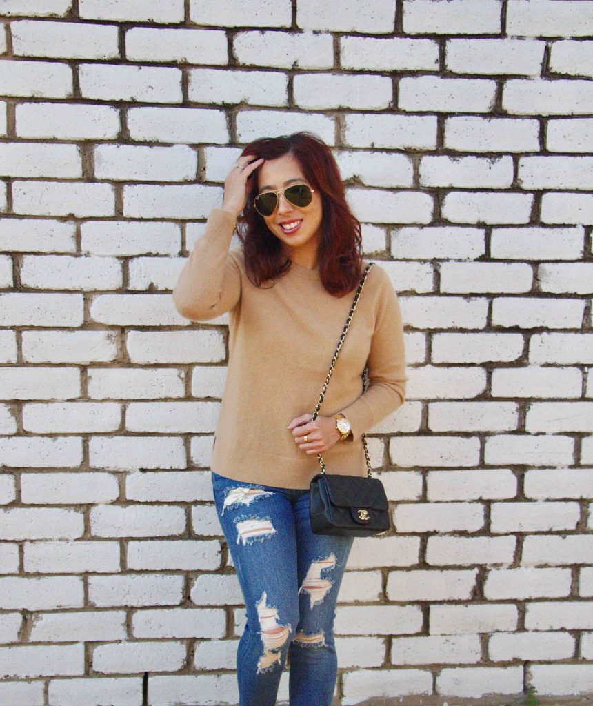 This cozy, cashmere sweater is one of my favorite purchases from this season. It’s so easy to style and warm especially for the colder weather. I love to keep things casual by pairing it with distressed denim. I couldn’t resist pairing it with my Chanel slingbacks. Love a good classic especially in beige! My Outfit…
